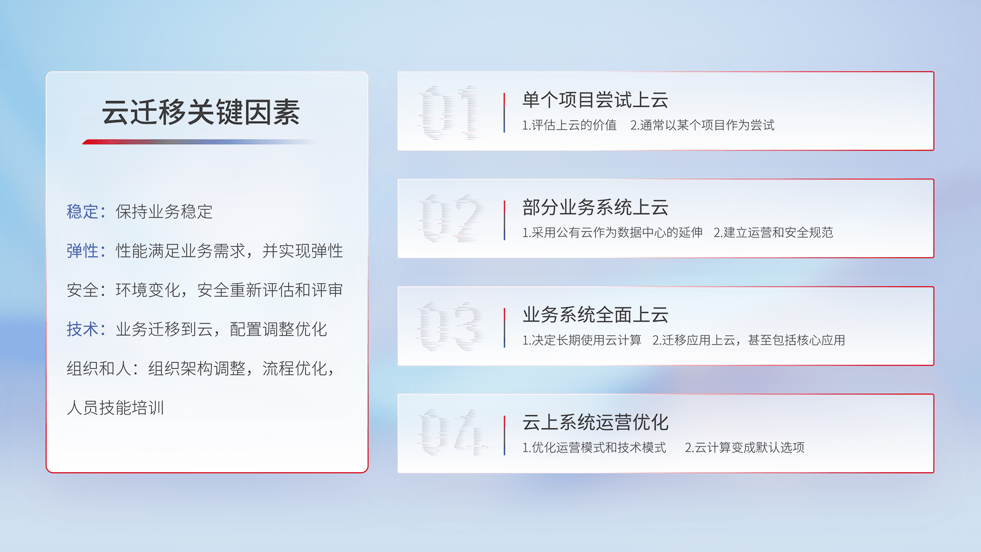 结合实际业务,,,从规划设计、、、、云平台选型、、云原生改造、、、、数据迁移、、、集成交付,,,,迁移全过程为客户识别最佳上云路径,,,,做好风险识别管理,,设计网络架构、、、、身份权限、、安全审计合规、、操作审计、、、、日志审计、、、、监控告警策略、、、多站点容灾设计等,,,,对云上基础设施进行整体规划,,,提升IT治理水平,,以满足弹性、、、高可用、、高性能的需求。。